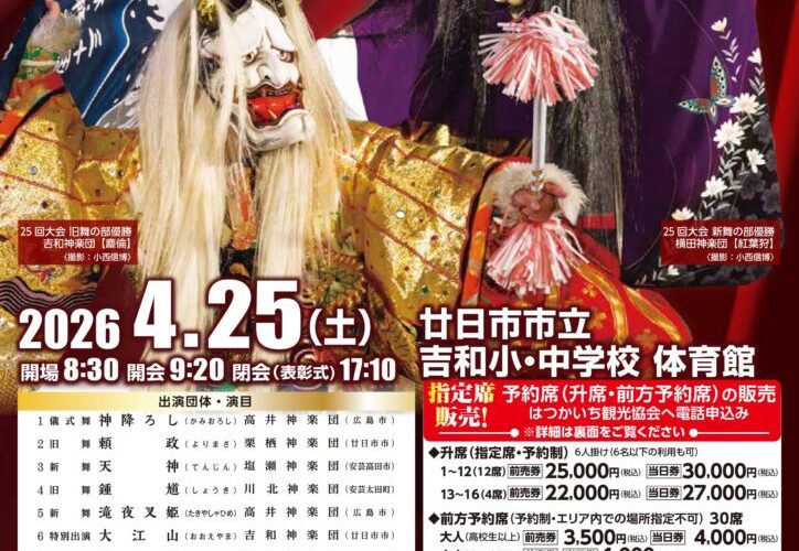 4月252026 川北神楽団 津浪神楽団 春選抜 第26回 吉和神楽競演大会 2026年4月25日(土)、廿日市市立吉和小・中学校体育館において、春選抜第26回吉和神楽競演大会が開催されます。 安芸太田町から...