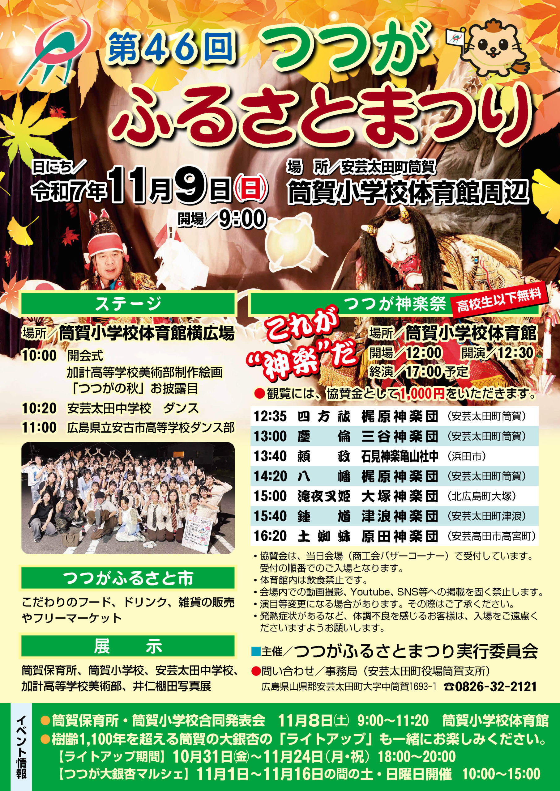 11月092025 つつがふるさと祭り つつが神楽祭 三谷神楽団 梶原神楽団 津浪神楽団 チラシのダウンロード 概要 日時2025年11月9日(日)開場12:00 開演12:30 会場〒731-3702 広島県山県郡安芸太田町中筒賀1782 筒賀小学校体育館周辺 料金神楽観覧には、協賛金として1,000円いただきます。 高校生以下無料 主催つつがふるさとまつり実行委員会 お問合せ0826-32-2121(事務局:安芸太田町役場筒賀支所) 広島県山県郡安芸太田町大字中筒賀1693−1 演目 12:35四方祓 梶原神楽団(安芸太田町筒賀) 13:00塵倫 三谷神楽団(安芸太田町筒賀) 13:40頼政 石見神楽亀山社中(浜田市) 14:20八幡 梶原神楽団(安芸太田町筒賀) 15:00滝夜叉姫 大塚神楽団(北広島町大塚) 15:40鍾馗 津浪神楽団(安芸太田町) 16:20土蜘蛛 原田神楽団(安芸高田市高宮町) MAP
