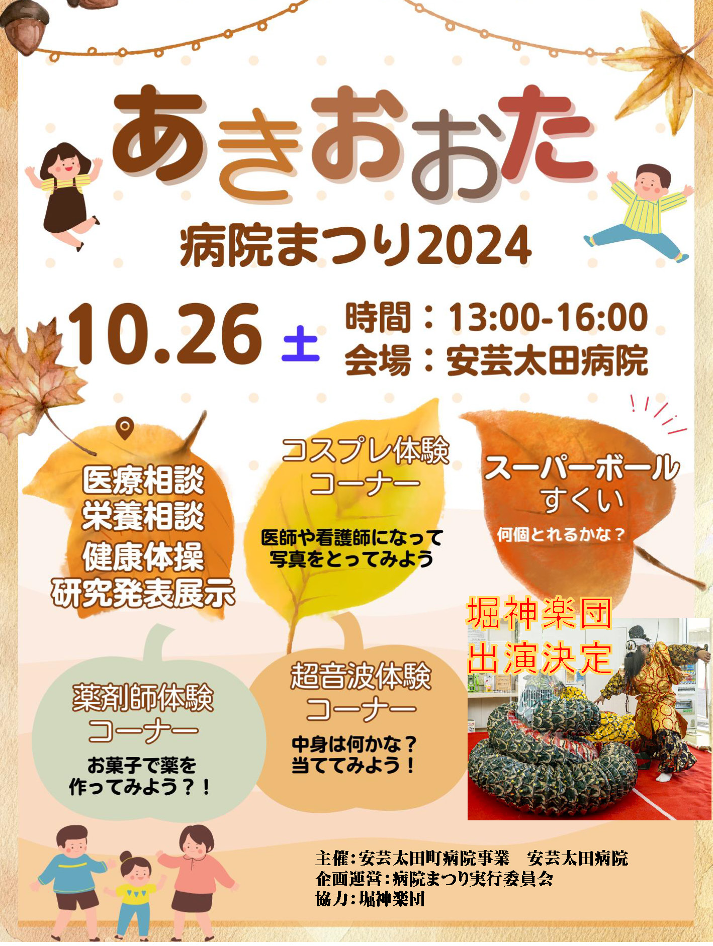 10月262024 中止:安芸太田病院祭り 堀神楽団 現在、地域や、院内で、コロナが流行している為、安芸太田病院まつりの開催を中止が決定されました。 概要 日時2024年10月26日(土) 13:00~16:00 会場〒731-3622 広島県山県郡安芸太田町下殿河内236 安芸太田病院 上演神楽団堀神楽団 MAP